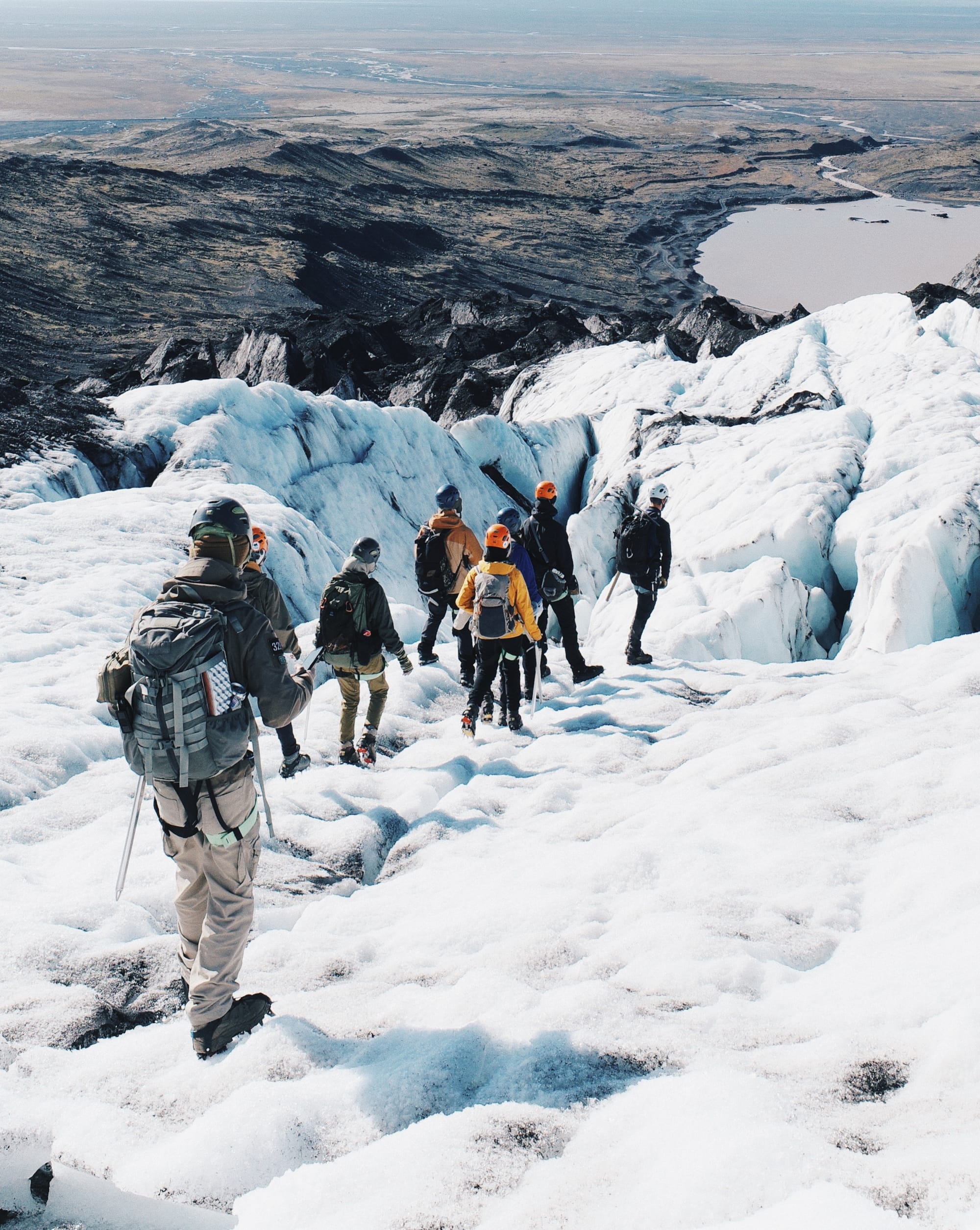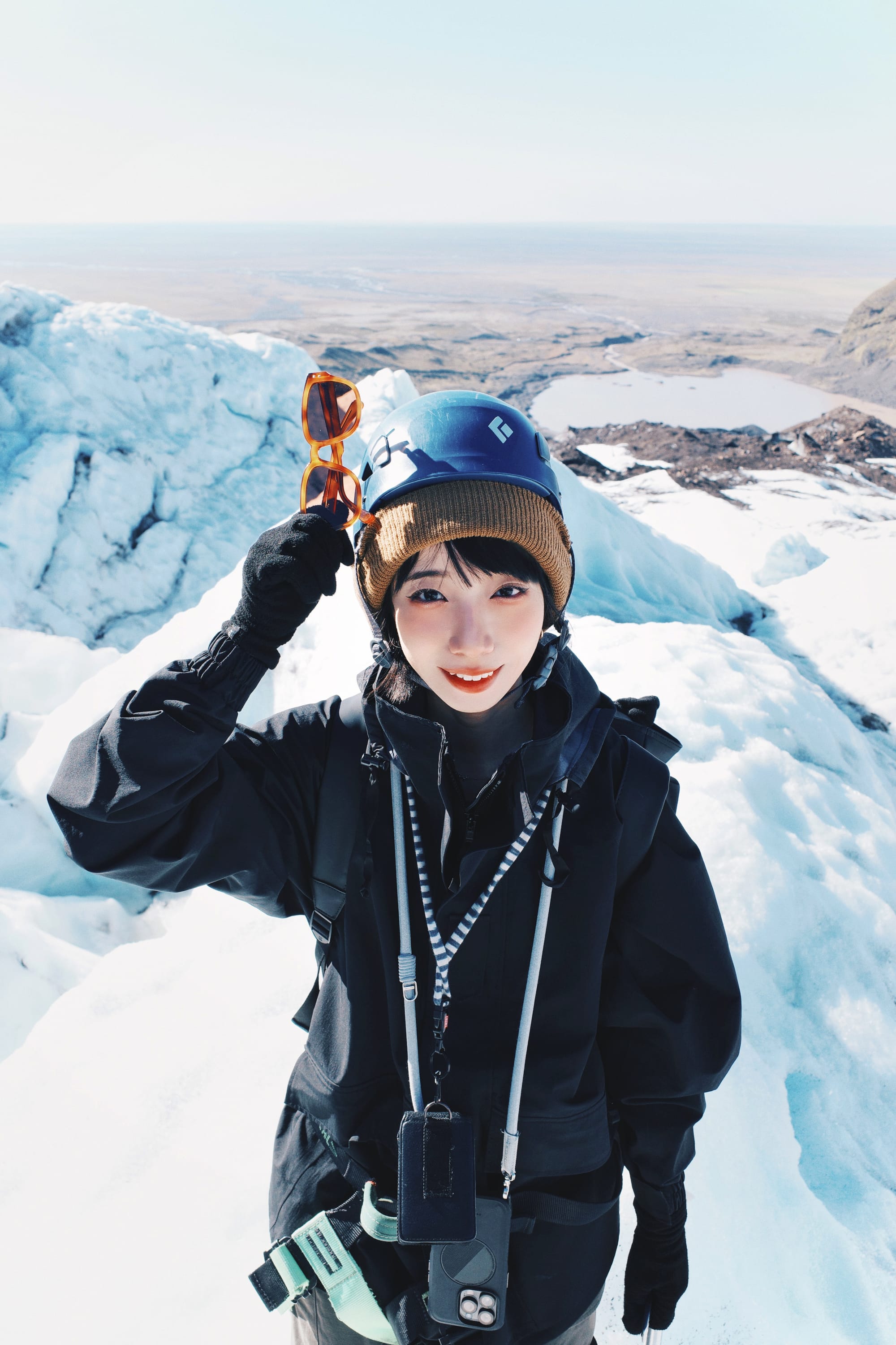 以前在台灣只看過霧淞,但從來沒有真正看過雪。到了冰島,站在一整片巨大的冰川前,那個震撼感是完全不一樣的。那次是外國嚮導帶領,我們要拿冰斧、穿冰爪,每一步都要很專心,腳踩下去的感覺跟在其他地方行走完全不同。很有趣的是,爬的時候太陽其實很大,冰面反射的光讓人覺得很熱,但只要一停下來,又會瞬間感覺到冷,身體一直在「動」跟「停」之間切換,感官變得很敏銳。