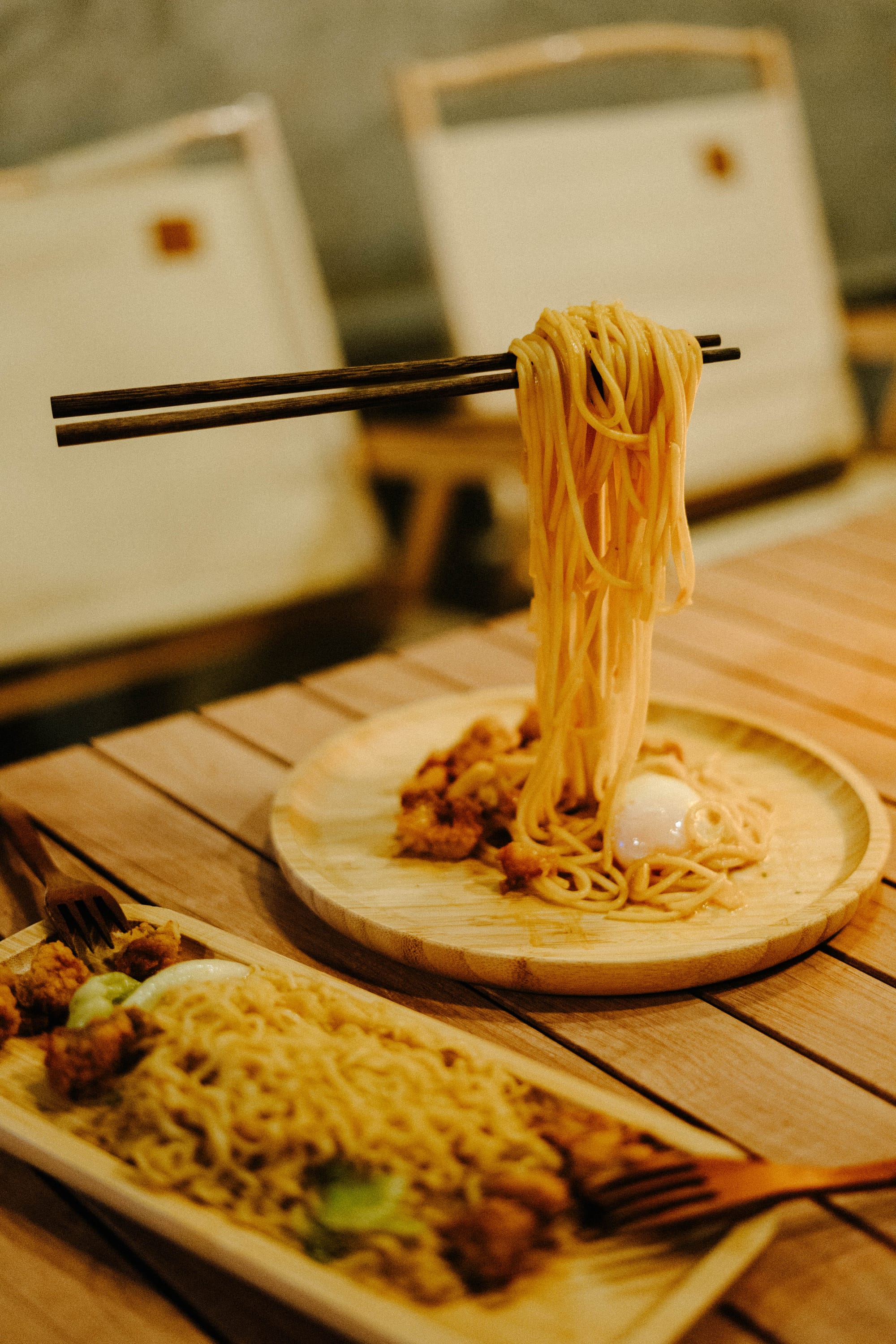 暖黃燈光配上樹葉牆面