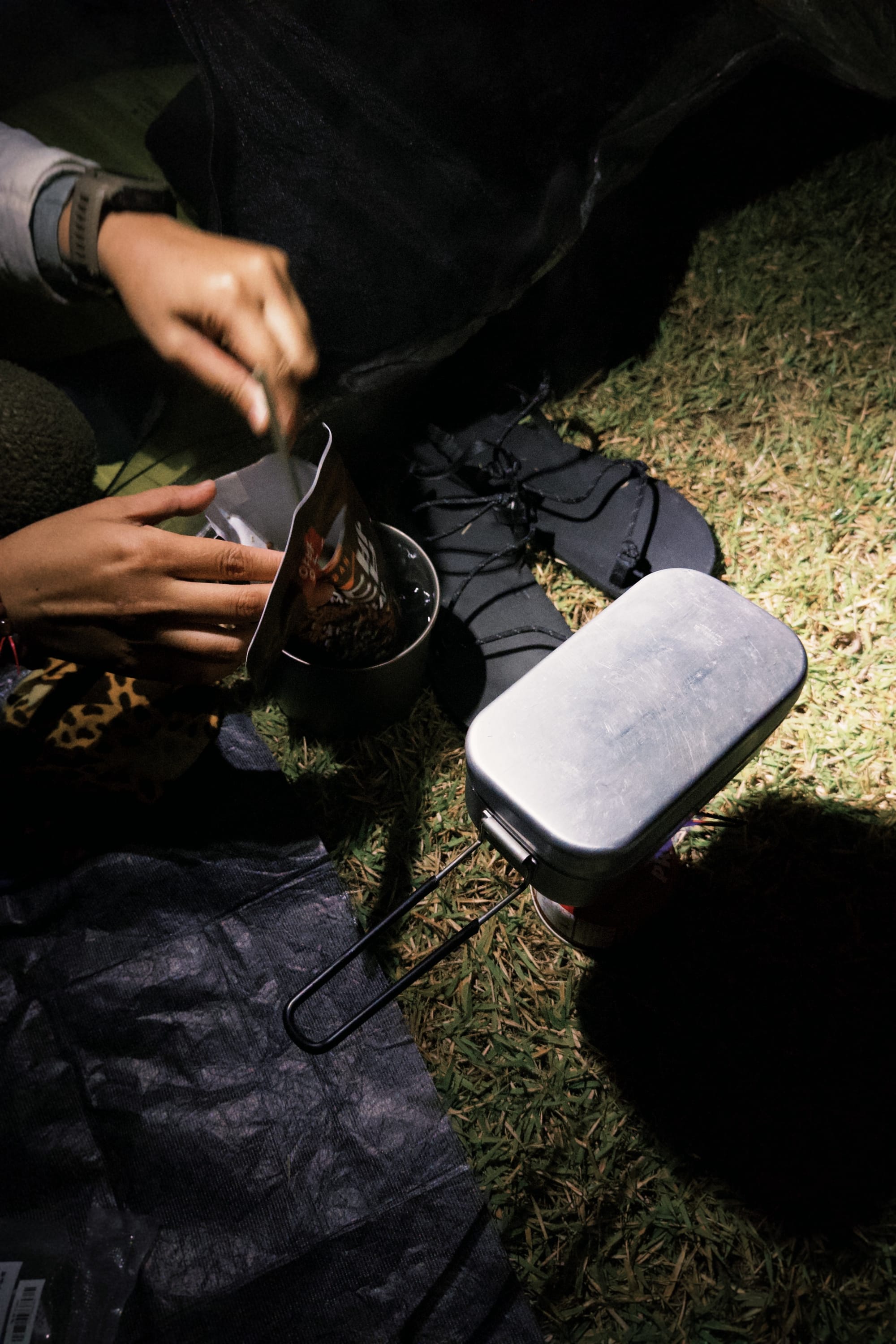 主辦單位在營地提供的食物,我們都覺得這個量基本上好像不需要自己帶晚餐了⋯,有即時粥兩包、兩條果膠、若干廠商贊助零食、一罐燒酒、一罐精釀啤酒,是要多幸福?因為隔天要早起,我們速速解決晚餐就直接睡起來。
