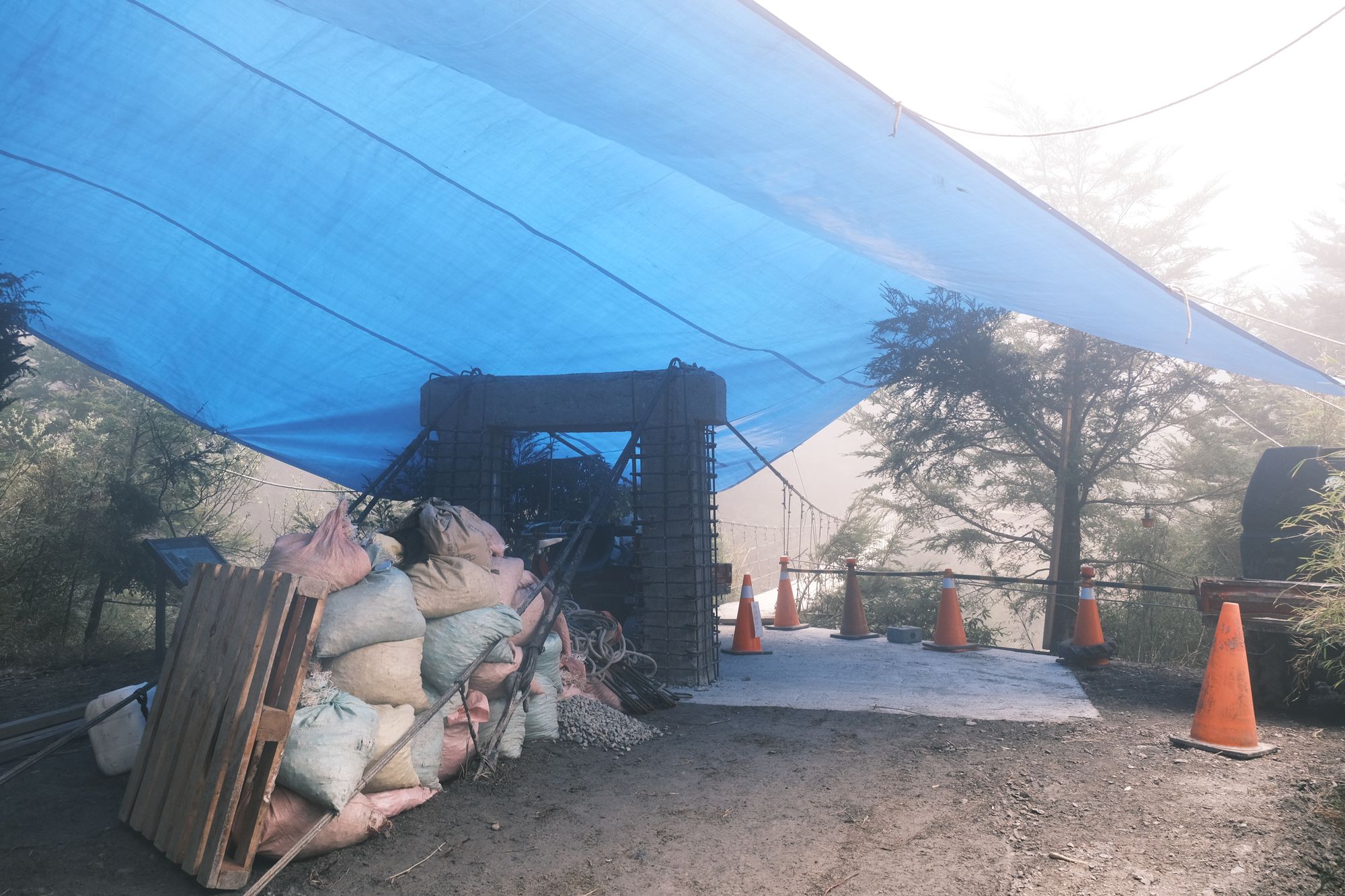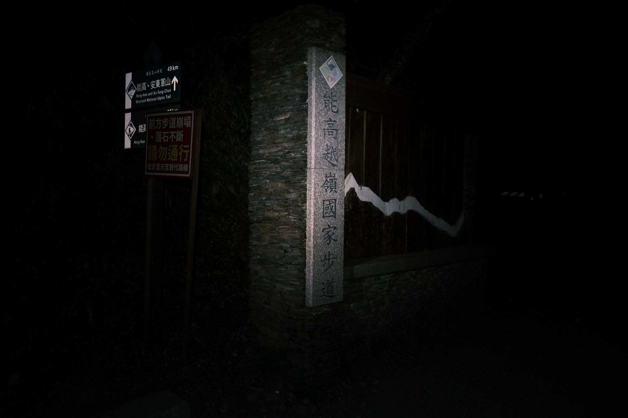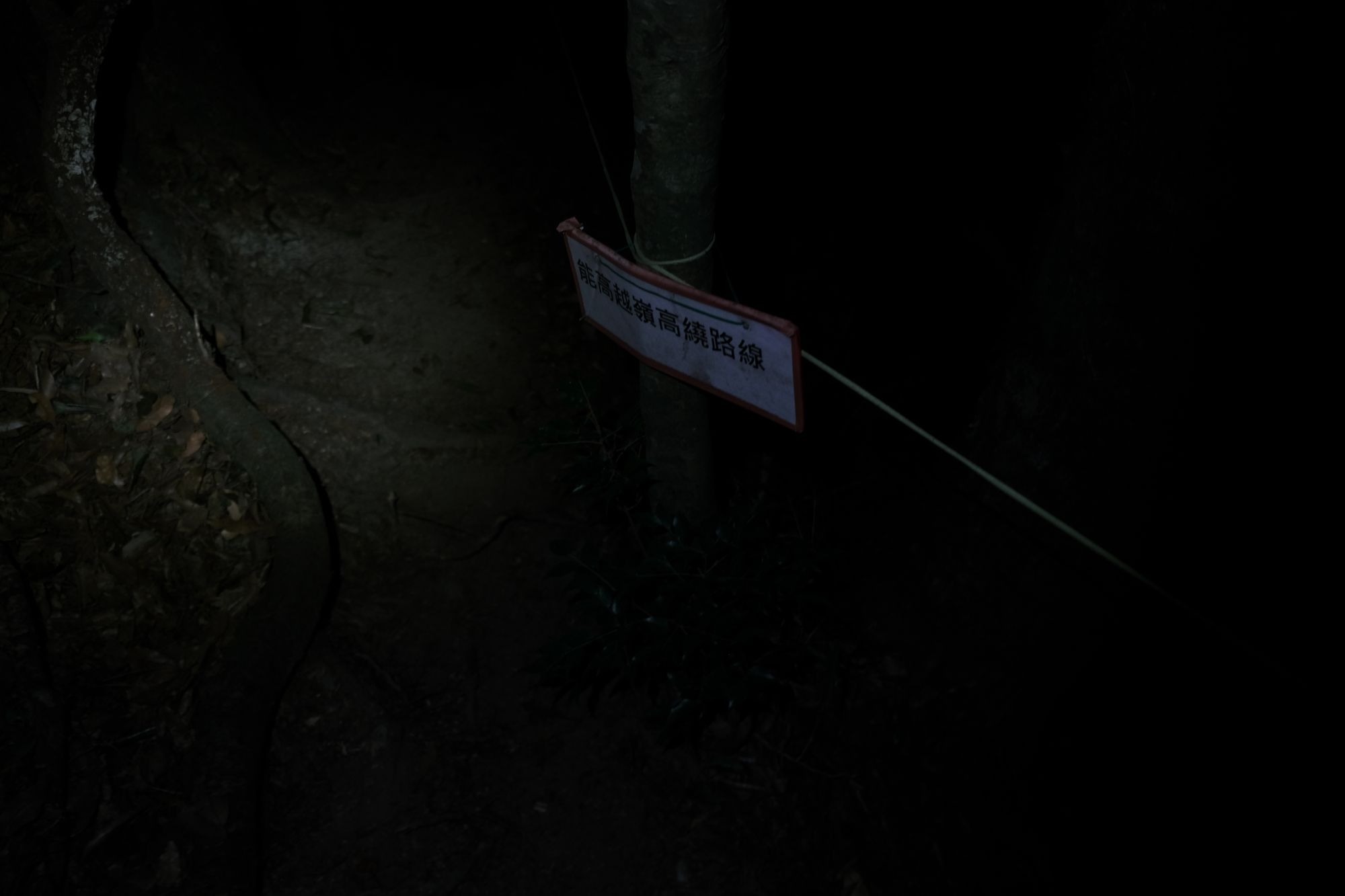 03:13 來到熟悉的登山口,沒看清楚就往裡面走,走到 0.5k 崩壁,發現與我們上次走的路不太一樣,因為,路崩了⋯⋯。嘗試走了三步,卻聽見前方不遠處繼續有落石的聲音,只好認命地走回屯原登山口,往高繞路段前進。