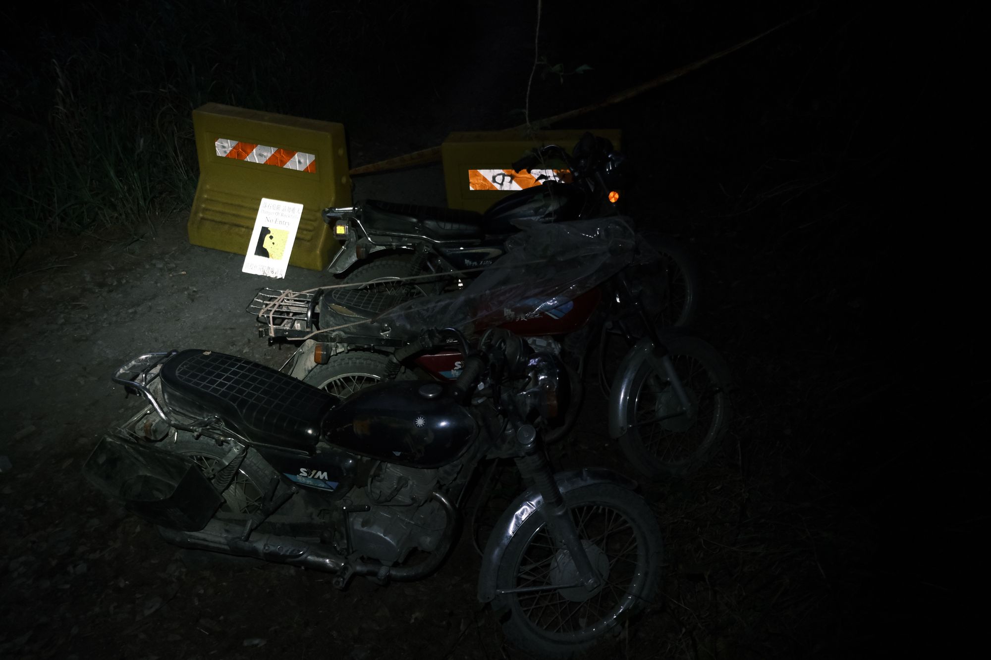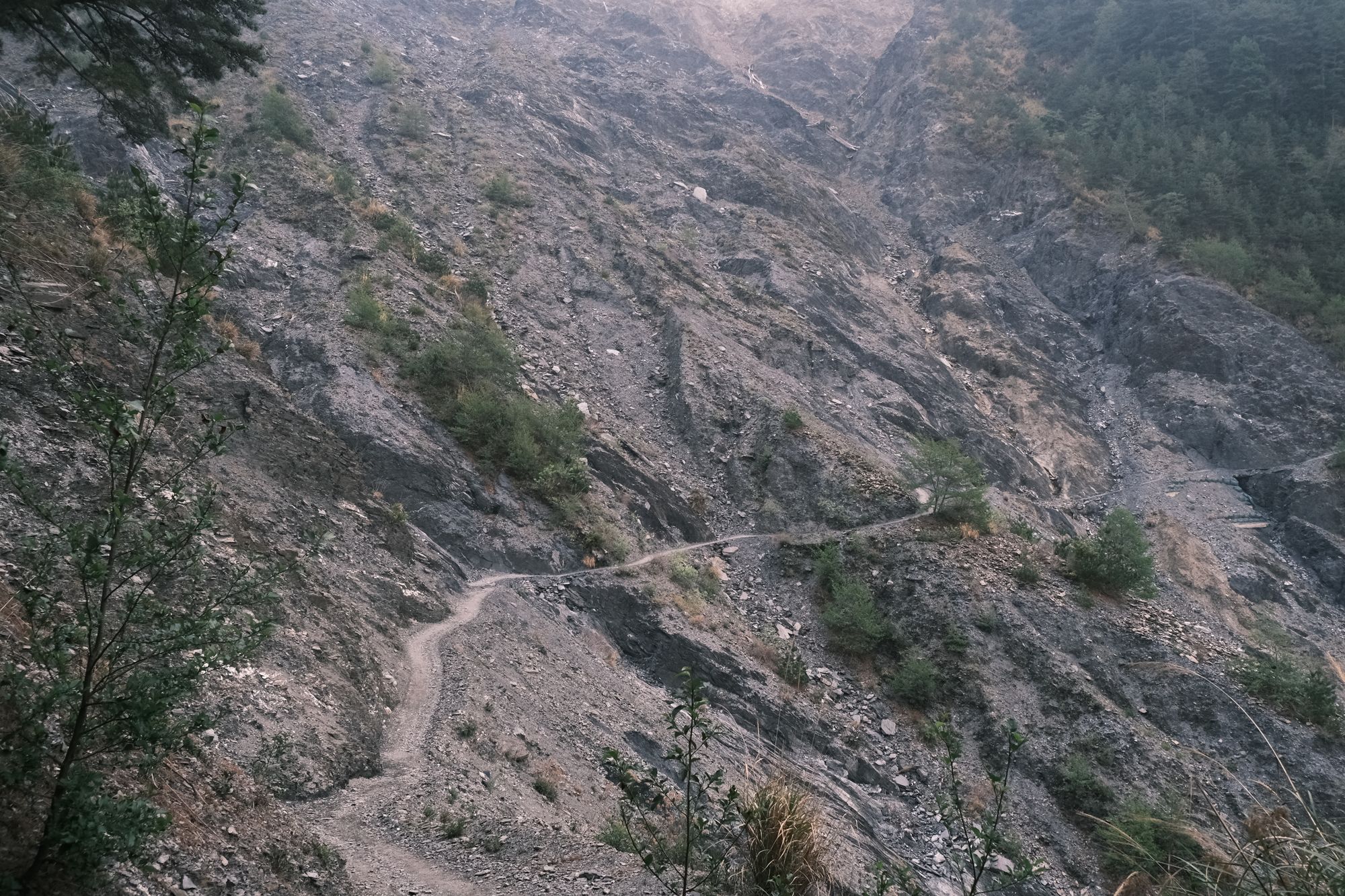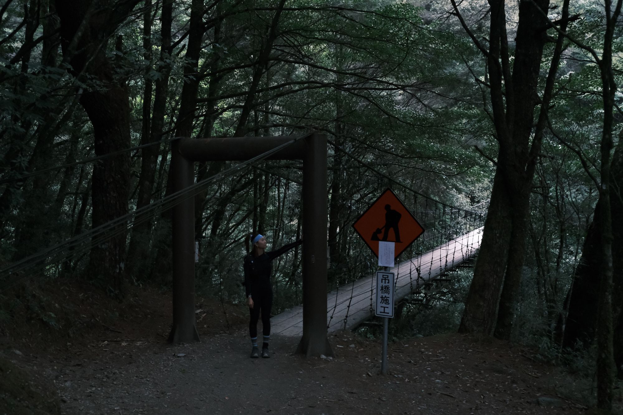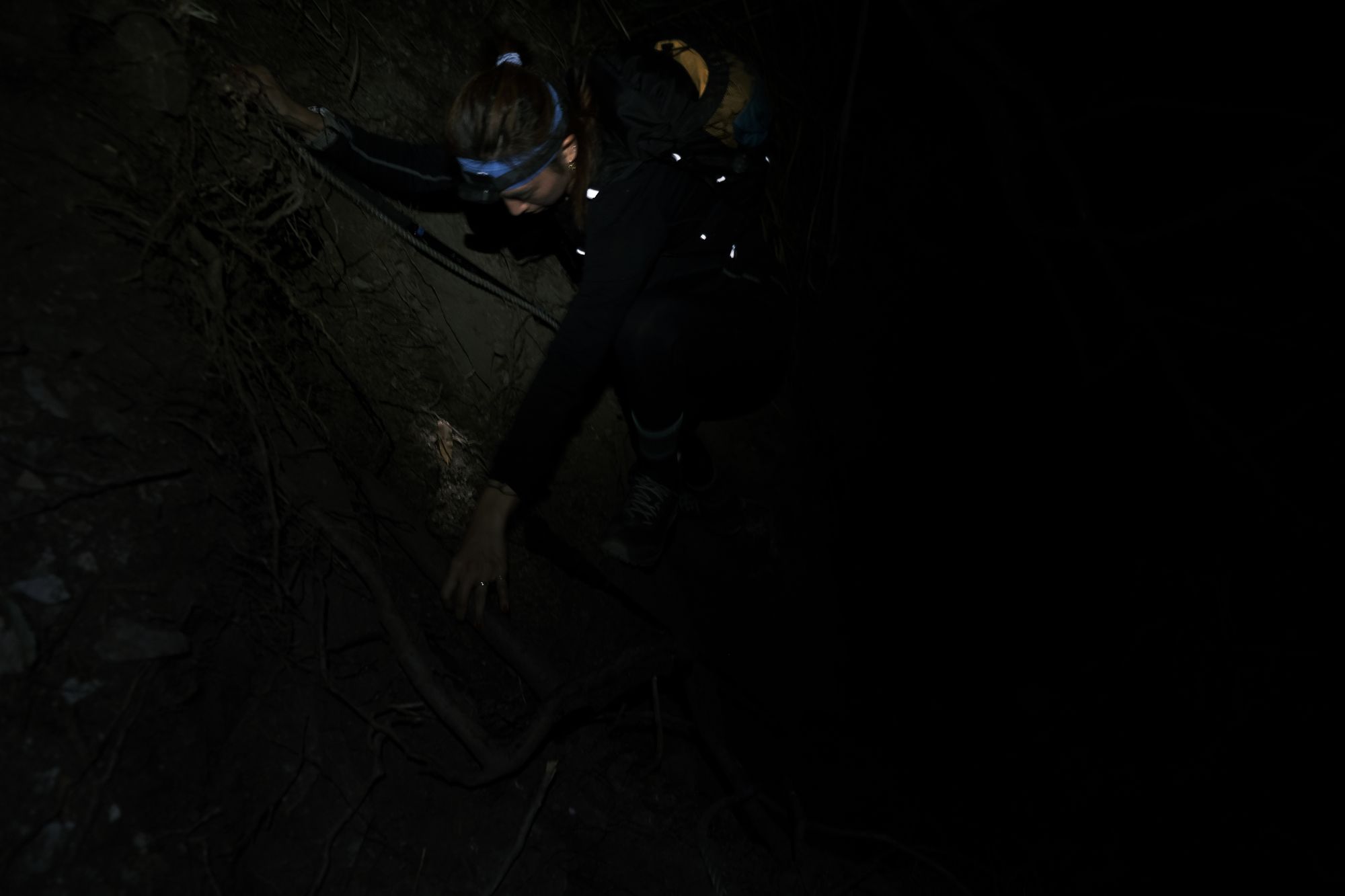 03:13 來到熟悉的登山口,沒看清楚就往裡面走,走到 0.5k 崩壁,發現與我們上次走的路不太一樣,因為,路崩了⋯⋯。嘗試走了三步,卻聽見前方不遠處繼續有落石的聲音,只好認命地走回屯原登山口,往高繞路段前進。