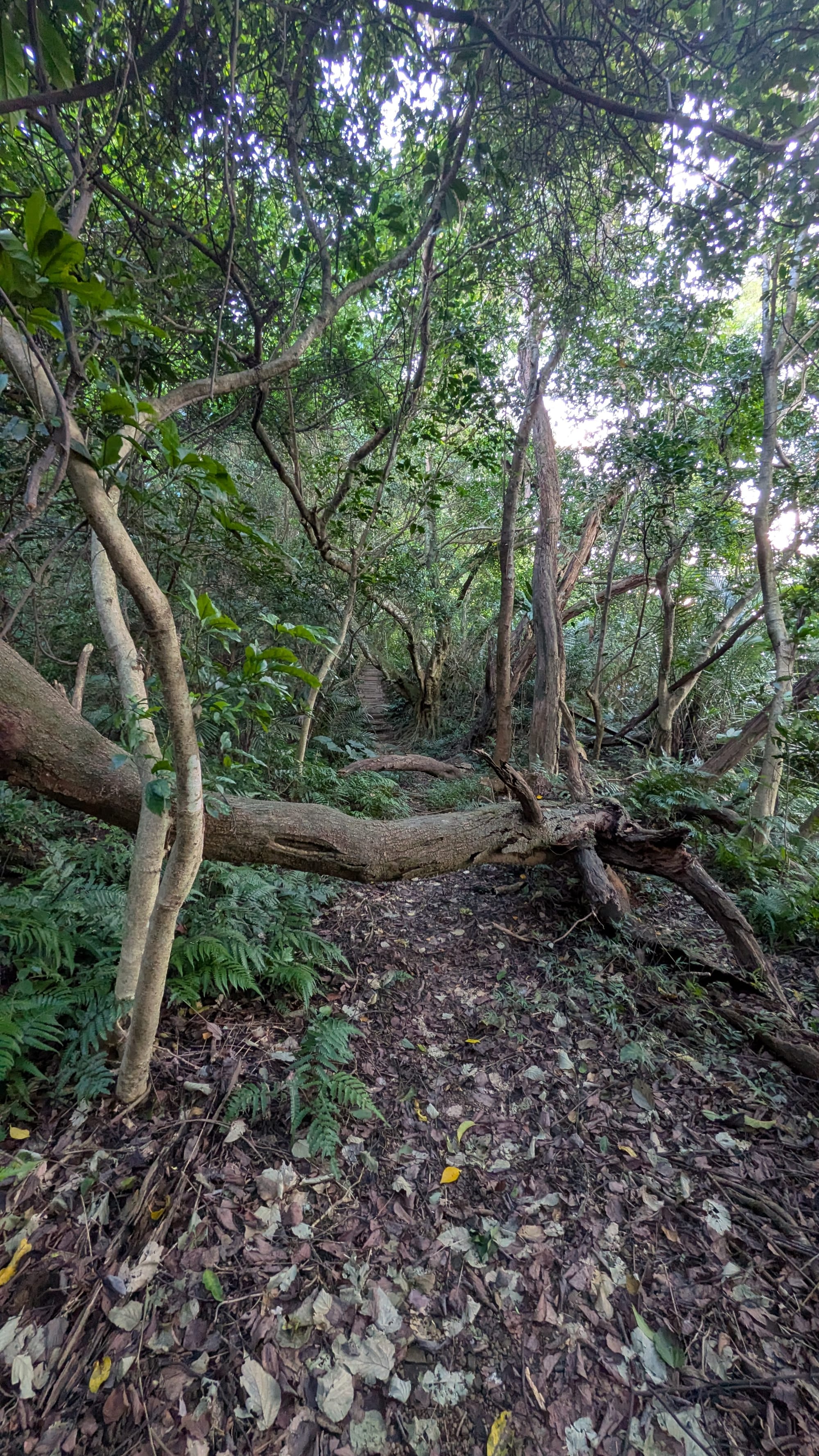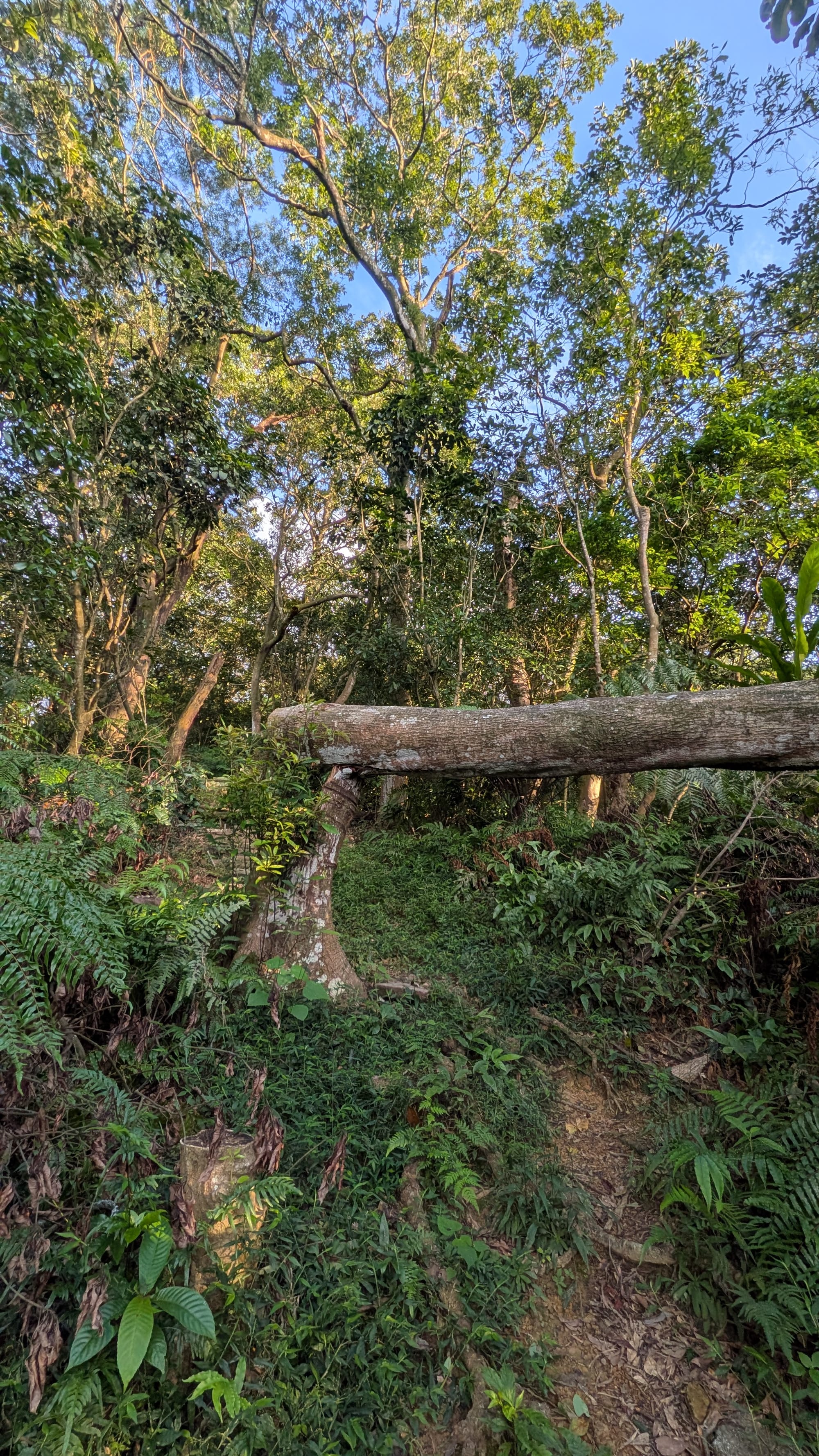 下了太極嶺後,我往南天母路方向下山。這段路似乎較少人行走,雖然沿途都有指標,但步道路徑不算明顯,途中還有兩三棵倒樹橫擋,需要上翻下鑽,一度讓我懷疑自己是否走在正確的路上。