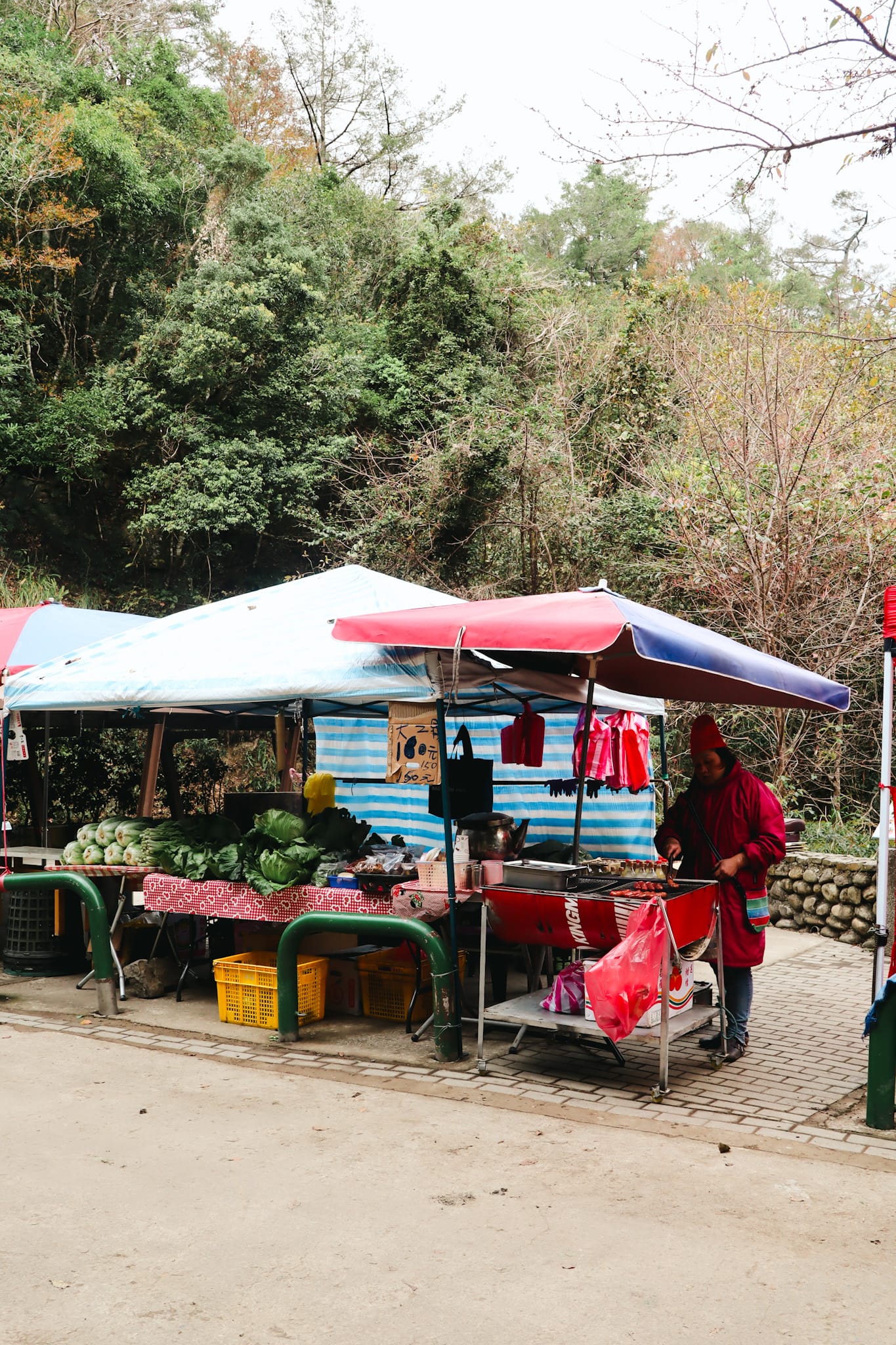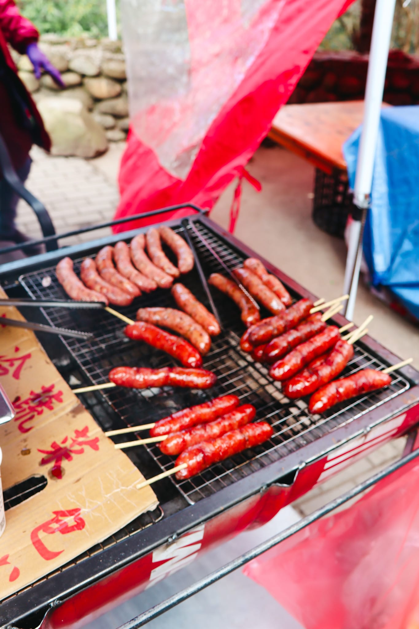 花了 1.5hr 原路折返回到登山口,這裡的市集有賣香腸,普通的一支 $50,馬告香腸則是 $60,我吃原味的覺得味道還不錯!