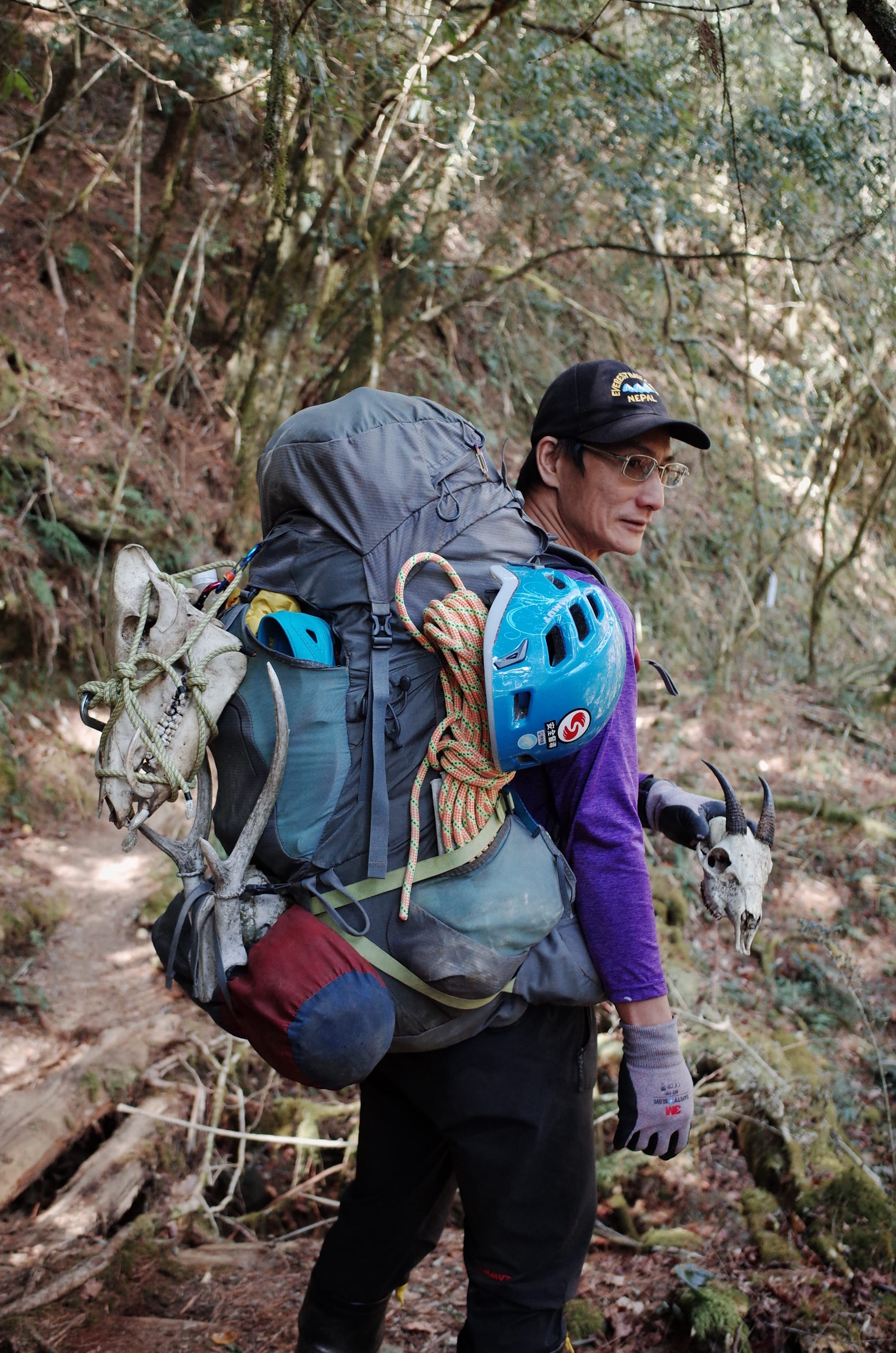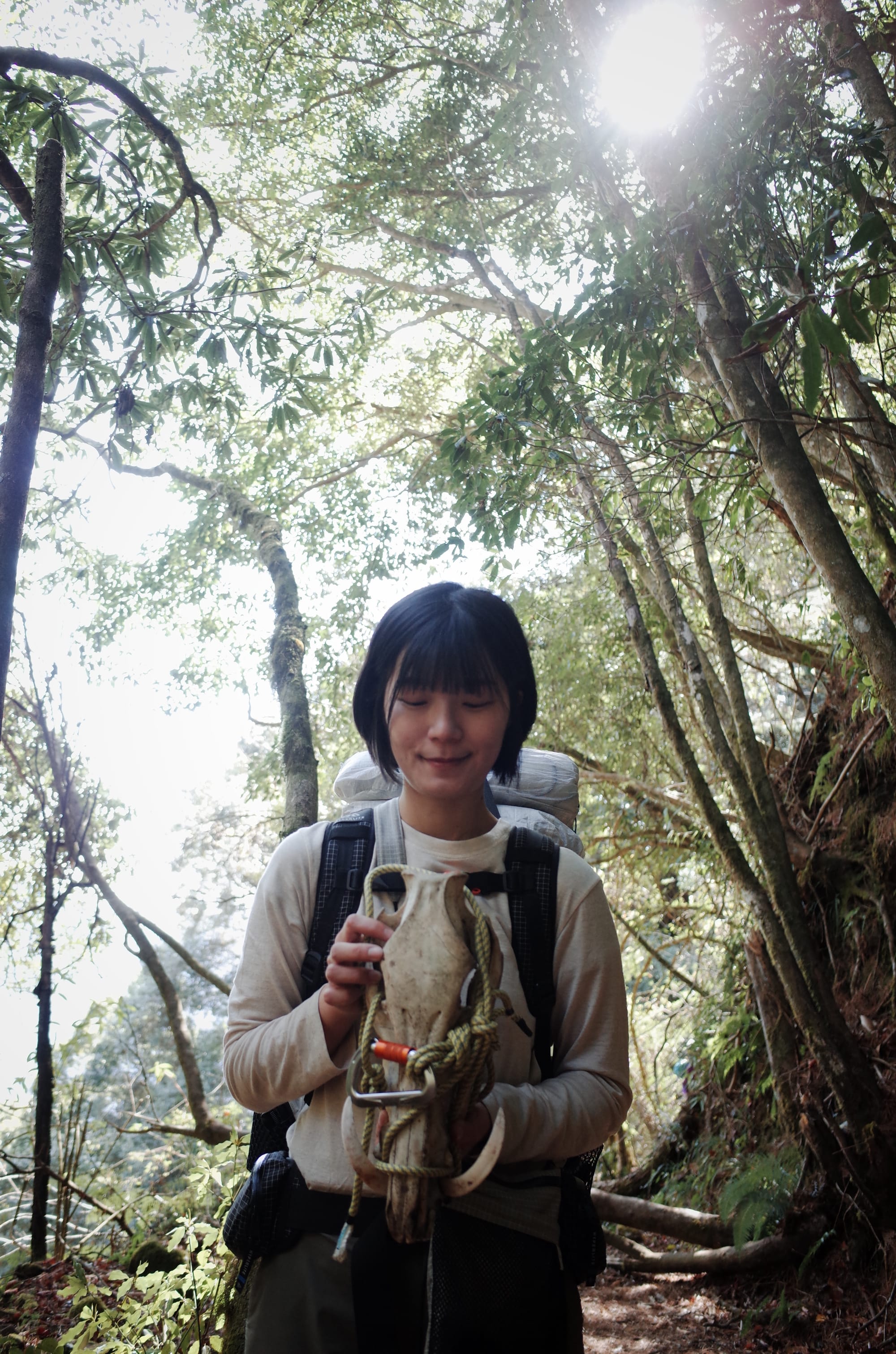 後來,其中一位前輩鑽進兩塊巨石之間,在洞穴裡發現了一顆完整的小山羊顱頭;接著,另一位前輩憑直覺下切進偏離方向的林地,瞬間舉起了一顆巨大的鹿頭。那一刻,我們三個人在完全渺無人煙的深山裡忍不住歡呼,純粹又難得。